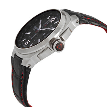 Stainless steel case with a black leather strap. Fixed stainless steel bezel. Black dial with luminous silver-tone hands and index hour markers. Arabic numerals mark the 6 and 12 o'clock positions. Minute markers. Tachymeter around the outer rim. Dial Type: Analog. Luminescent hands and markers. Date display at the 3 o'clock position. Chronograph - two sub-dials displaying: 30 minute and 12 hour. Alpina calibre AL-725 automatic movement, based upon ETA Valjoux 7750, containing 25 Jewels, bitting at 28800 vph, and has a power reserve of approximately 46 hours. Scratch resistant sapphire crystal. Screw down crown. Transparent screw down case back. Round case shape. Case size: 45 mm. Case thickness: 14 mm. Band width: 28 mm. Deployment clasp. Water resistant at 100 meters / 330 feet. Functions: chronograph, date, hour, minute, second, tachymeter. Racing Series. Luxury watch style. Watch label: Swiss Made. Alpina Racing Chronograph Black Dial Black Leather Men's Watch AL725AB5AR26.