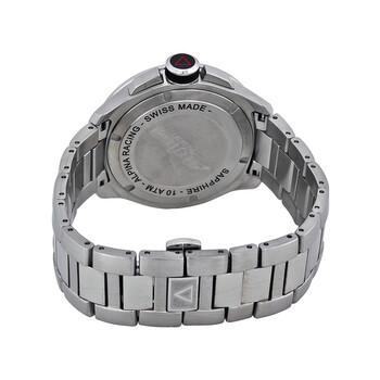 Silver-tone stainless steel case with a silver-tone stainless steel bracelet. Fixed silver-tone stainless steel bezel. Black dial with silver-tone hands and index hour markers. Minute markers around the outer rim. Dial Type: Analog. Luminescent hands and markers. Date display at the 12 o'clock position. Chronograph - three sub-dials displaying: 60 seconds, 30 minutes and 12 hours. Alpina Calibre AL-353 quartz movement. Scratch resistant anti-reflective sapphire crystal. Screw down crown. Solid case back. Round case shape, case size: 45 mm, case thickness: 11 mm. Band width: 21 mm, band length: 8 inches. Deployment with push button release clasp. Water resistant at 100 meters / 330 feet. Functions: chronograph, date, hour, minute, second. Racing Series. Luxury watch style. Watch label: Swiss Made. Alpina Racing Chronograph Black Dial Men's Watch AL353B5AR36B.