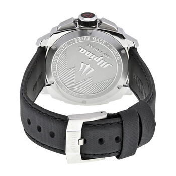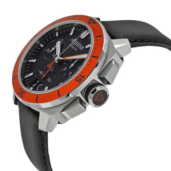 Stainless steel case with a black leather strap. Uni-directional rotating stainless steel bezel with an inlaid orange ring. Black dial with luminous hands and index hour markers. Minute markers around the outer rim. Dial Type: Analog. Luminescent hands and markers. Date display at the 6 o'clock position. Chronograph - three sub-dials displaying: 60 second, 30 minute and 1/10th of a second. Alpina calibre AL-372 quartz movement with a 48 months power reserve. Scratch resistant sapphire crystal. Screw down crown. Solid case back. Round case shape. Case size: 44 mm. Case thickness: 14 mm. Band width: 22 mm. Band length: 8 inches. Tang clasp. Water resistant at 300 meters / 1000 feet. Functions: chronograph, date, hour, minute, second. Luxury watch style. Watch label: Swiss Made. Item Variations: AL 372LBO4V6, AL.372LBO4V6, AL372LBO4V6. Alpina Seastrong Diver 300 Big Date Chronograph Black Dial Black Leather Men's Watch AL-372LBO4V6.
