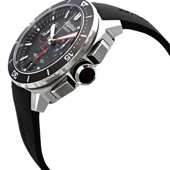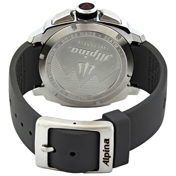 Stainless steel case with a black leather strap. Uni-directional rotating stainless steel bezel. Black dial with index hour markers. Minute markers around the outer rim. Dial Type: Analog. Luminescent hands and markers. Date display at the 6 o'clock position. Chronograph - three sub-dials displaying: 60 second, 30 minute and 1/10th of a second. Quartz movement. Scratch resistant sapphire crystal. Screw in crown. Solid case back. Case diameter: 44 mm. Round case shape. Water resistant at 300 meters / 1000 feet. Functions: chronograph, date, hour, minute, second. Luxury watch style. Watch label: Swiss Made. Item Variations: AL 372LBG4V6, AL.372LBG4V6, AL372LBG4V6. Alpina Seastrong Diver 300 Big Date Black Dial Chronograph Men's Watch AL-372LBG4V6.