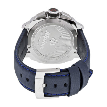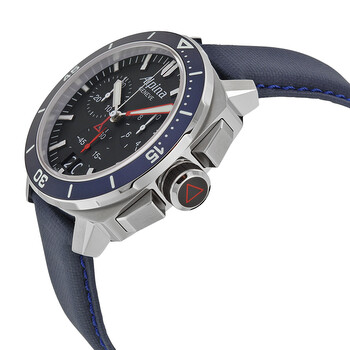 Stainless steel case with a navy leather strap. Uni-directional rotating stainless steel bezel with a navy top ring. Black dial with luminous silver and red hands and index hour markers. Minute markers around the outer rim. Dial Type: Analog. Luminescent hands and markers. Date display at the 6 o'clock position. Chronograph - three sub-dials displaying: 60 second, 30 minute and 1/10th of a second. Quartz movement. Scratch resistant sapphire crystal. Screw down crown. Solid case back. Case diameter: 44 mm. Case thickness: 12 mm. Round case shape. Strap width: 22 mm. Tang clasp. Water resistant at 300 meters / 1000 feet. Functions: chronograph, date, hour, minute, second. Luxury watch style. Watch label: Swiss Made. Item Variations: AL 372LBN4V6, AL.372LBN4V6, AL372LBN4V6. Alpina Seastrong Diver 300 Big Date Chronograph Black Dial Navy Leather Men's Watch AL-372LBN4V6.