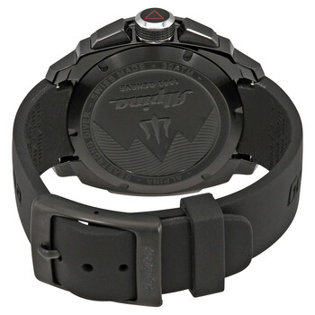 Black PVD stainless steel case with a black rubber strap. Uni-directional rotating black PVD bezel with an inlaid black ring. Black dial with luminous grey hands and index hour markers. Minute markers around the outer rim. Dial Type: Analog. Luminescent hands. Date display at the 6 o'clock position. Chronograph - three sub-dials displaying: 60 second, 30 minute and 1/10th of a second. Alpina calibre AL-372 quartz movement. Scratch resistant sapphire crystal. Screw down crown. Solid case back. Case size: 44 mm. Case thickness: 14.35 mm. Round case shape. Band width: 22 mm. Tang clasp. Water resistant at 300 meters / 1000 feet. Functions: chronograph, date, hour, minute, second. Sport watch style. Watch label: Swiss Made. Alpina Seastrong Diver 300 Chronograph Men's Watch 372LBBG4FBV6.