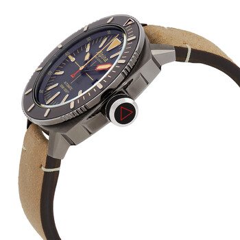 Titanium PVD coated stainless steel case with a light brown leather strap. Uni-directional rotating titanium PVD coated bezel with an inlaid grey ring. Grey dial with luminous black hands and index hour markers. Minute markers. Arabic numeral minute markers (at 5 minute intervals) around the outer rim. Dial Type: Analog. Luminescent hands and markers. Date display at the 3 o'clock position. Alpina calibre AL-525 automatic movement, based upon Sellita SW200-1, containing 26 Jewels, bitting at 28800 vph, and has a power reserve of approximately 38 hours. Scratch resistant sapphire crystal. Screw down crown. Transparent case back. Round case shape. Case size: 44 mm. Case thickness: 13 mm. Band width: 22 mm. Tang clasp. Water resistant at 300 meters / 1000 feet. Functions: date, hour, minute, second. Seastrong Diver Series. Dive watch style. Watch label: Swiss Made. Alpina Seastrong Diver Automatic Grey Dial Men's Watch AL-525LGG4TV6.