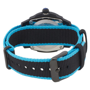 Alpina Unisex Black PVD stainless steel case with a black and blue NATO band. Uni-directional rotating blue PVD stainless steel bezel. Black dial with silver-tone hands and index hour markers. Minute markers around the outer rim. Dial Type: Analog. Luminescent hands and markers. Date display at the 3 o'clock position. Automatic movement. Scratch resistant sapphire crystal. Screw down crown. Solid case back. Round case shape, case size: 36 mm, case thickness: 11.95 mm. Water resistant at 300 meters / 1000 feet. Functions: date, hour, minute, second. Seastrong Diver Comtesse Gyre Series. Dive watch style. Watch label: Swiss Made. Alpina Seastrong Diver Comtesse Gyre Automatic Black Dial Ladies Watch AL-525LBN3VG6.