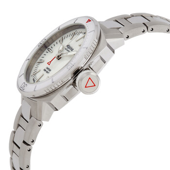 Stainless steel case with a stainless steel bracelet. Uni-directional rotating stainless steel bezel. White mother of pearl dial with luminous silver-tone hands and index hour markers. Minute markers around the outer rim. Dial Type: Analog. Luminescent hands and markers. Date display at the 3 o'clock position. Alpina calibre AL-240 quartz movement. Scratch resistant sapphire crystal. Screw down crown. Solid case back. Round case shape. Case size: 34 mm. Case thickness: 10.15 mm. Band width: 17.5 mm. Fold over clasp. Water resistant at 300 meters/1000 feet. Functions: date, hour, minute, second. Seastrong Diver Comtesse Series. Casual watch style. Watch label: Swiss Made. Alpina Seastrong Diver Comtesse Quartz White Mother of Pearl Dial Ladies Watch AL-240MPW2VC6B.