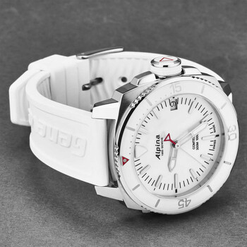 Stainless steel case with a white rubber strap. Uni-directional rotating stainless steel bezel with an inlaid silver ring. White mother of pearl dial with luminous silver-tone hands and index hour markers. Minute markers around the outer rim. Dial Type: Analog. Luminescent hands and markers. Date display at the 3 o'clock position. Alpina calibre AL-240 quartz movement. Scratch resistant sapphire crystal. Screw down crown. Solid case back. Round case shape. Case size: 34 mm. Case thickness: 10.15 mm. Tang clasp. Water resistant at 300 meters/1000 feet. Functions: date, hour, minute, second. Seastrong Diver Comtesse Series. Casual watch style. Watch label: Swiss Made. Alpina Seastrong Diver Comtesse White Mother of Pearl Dial Ladies Watch AL-240MPW2VC6.