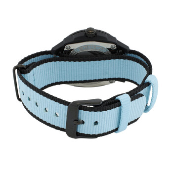 Black PVD stainless steel case with a blue and black nylon NATO strap. Uni-directional rotating black PVD bezel. Blue mother of pearl dial with luminous silver-tone hands and dot hour markers. Indexmarkers at the 6, 9 and 12 o'clock positions. Minute markers around the outer rim. Dial Type: Analog. Luminescent hands. Date display at the 3 o'clock position. Alpina calibre AL-525 automatic movement, based upon Sellita SW200-1, containing 26 Jewels, bitting at 28800 vph, and has a power reserve of approximately 38 hours. Scratch resistant sapphire crystal. Screw down crown. Solid case back. Round case shape.Case size: 36 mm. Case thickness: 11.75 mm. Band width: 17 mm. Buckle clasp. Water resistant at 300 meters / 1000 feet. Functions: date, hour, minute, second. Seastrong Diver Gyre Series. Casual watch style. Watch label: Swiss Made. Alpina Seastrong Diver Gyre Automatic Ladies Watch AL-525LMPLNB3VG6.