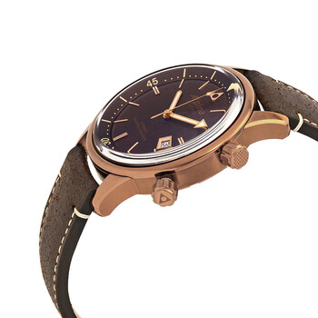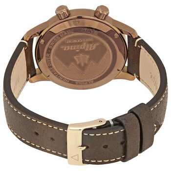 c Rose gold-plated stainless steel case with a dark brown leather strap. Fixed rose gold-plated stainless steel bezel. Brown dial with luminous rose gold-tone arrow-shaped hands and index hour markers. Minute markers around the outer rim. Dial Type: Analog. Luminescent hands and markers. Date display at the 4 o'clock position. Alpina Calibre AL-525 Automatic movement, based upon Sellita SW200-1, containing 26 Jewels, bitting at 28800 vph, and has a power reserve of approximately 38 hours. Scratch resistant sapphire crystal. Screw down crown. Solid case back. Round case shape, case size: 42 mm, case thickness: 13 mm. Band width: 21 mm. Tang clasp. Water resistant at 300 meters / 1000 feet. Functions: date, hour, minute, second. Seastrong Diver Heritage Series. Casual watch style. Watch label: Swiss Made. Alpina Seastrong Diver Heritage Automatic Brown Dial Men's Watch AL-525BR4H4.