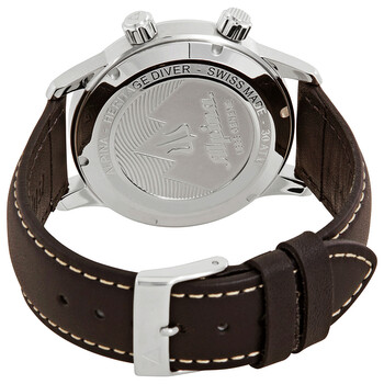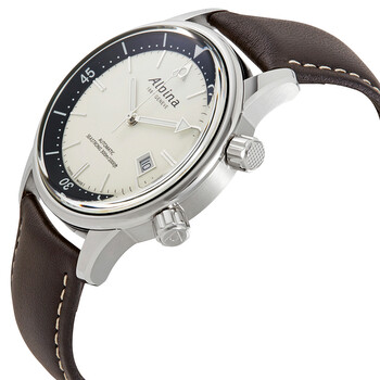 Stainless steel case with a black leather strap. Fixed stainless steel bezel. Silver dial with luminous silver-tone arrow-shaped hands and index hour markers. Minute markers. Dial Type: Analog. Luminescent hands and markers. Date display between the 3 and 4 o'clock positions. Alpina calibre AL-525 automatic movement, based upon Sellita SW200-1, containing 26 Jewels, bitting at 28800 vph, and has a power reserve of approximately 38 hours. Scratch resistant sapphire crystal. Screw down crown. Solid case back. Round case shape. Case size: 42 mm. Case thickness: 12.3 mm. Band width: 21 mm. Tang clasp. Water resistant at 300 meters / 1000 feet. Functions: date, hour, minute, second. Additional Info: internal 60 minute turning diving ring. Seastrong Diver Heritage Series. Luxury watch style. Watch label: Swiss Made. Alpina Seastrong Diver Heritage Automatic Men's Watch 525S4H6.