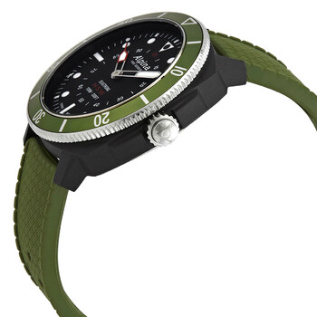 Black fiber glass case with a green rubber strap. Uni-directional rotating stainless steel bezel with green aluminium inlay. Black dial with luminous silver-tone hands and dot hour markers. 1/100th markers. Minute markers around the outer rim. Dial Type: Analog. Luminescent hands and markers. Alpina calibre MMT-282-1 quartz movement. Scratch resistant sapphire crystal. Pull / push crown. Solid case back. Round case shape. Case size: 44 mm. Case thickness: 14 mm. Band width: 22 mm. Tang clasp. Water resistant at 100 meters / 330 feet. Functions: hour, minute, second, always-on time, activity training, sleep monitoring and sleep cycle alarms, get-active alerts, dynamic coaching, cloud backup and restore, mobile notifications. Additional Info: in general, suitable for swimming and snorkeling, but not diving. Smart watch style. Watch label: Swiss Made. Alpina Seastrong Horological Quartz Black Dial Men's Watch AL-282LBGR4V6.