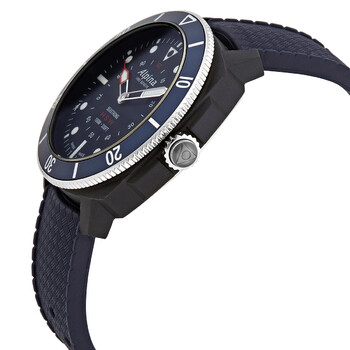 Black-plated stainless steel case with a blue rubber strap. Uni-directional rotating stainless steel bezel with a blue glass-fibre ring. Blue dial with luminous black and red hands and dot hour markers. 1/100th markers around an inner ring. Minute markers around the outer rim. Dial Type: Analog. Luminescent hands and markers. Alpina calibre MMT-282-1 quartz movement. Scratch resistant sapphire crystal. Screw down crown. Solid case back. Round case shape. Case size: 44 mm. Case thickness: 14 mm. Band width: 22 mm. Tang clasp. Water resistant at 100 meters / 330 feet. Functions: hour, minute, second, always-on time, activity training, sleep monitoring and sleep cycle alarms, get-active alerts, dynamic coaching, cloud backup and restore, mobile notifications. Seastrong Horological Series. Smart watch style. Watch label: Swiss Made. Alpina Seastrong Horological Quartz Blue Dial Men's Smart Watch AL-282LNN4V6.