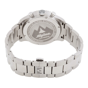 Silver-tone stainless steel case and bracelet. Silver-tone stainless steel bezel. White dial with silver-tone hands and Arabic numeral hour markers. Minute markers around the outer rim. Dial Type: Analog. Luminescent hands and markers. Date display at the 6 o'clock position. Chronograph - three sub-dials displaying: 60 second, 30 minute and 1/10th of a second. Alpina Calibre AL-372 quartz movement. Scratch resistant sapphire crystal. Solid case back. Round case shape, case size: 41 mm, case thickness: 12.75 mm. Water resistant at 100 meters / 330 feet. Functions: chronograph, big date, hour, minute, second. Startimer Series. Sport watch style. Watch label: Swiss Made. Alpina Startimer Chronograph Quartz White Dial Men's Watch AL-372WB4S26B.