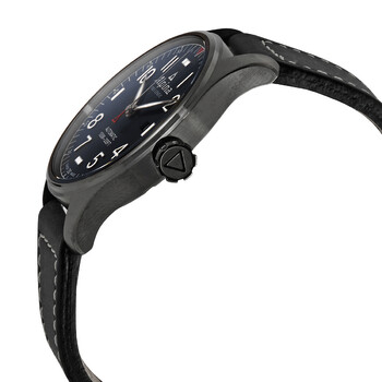 Black PVD stainless steel case with a black leather strap. Fixed black PVD bezel. Blue dial with luminous grey and red hands and Arabic numeral hour markers. Minute markers around the outer rim. Dial Type: Analog. Date display at the 3 o'clock position. Alpina calibre AL-525 automatic movement, based upon Sellita SW200-1, containing 26 Jewels, bitting at 28800 vph, and has a power reserve of approximately 38 hours. Scratch resistant sapphire crystal. Screw down crown. Solid case back. Round case shape. Case size: 44 mm. Case thickness: 10 mm. Band width: 22 mm. Tang clasp. Water resistant at 100 meters / 330 feet. Functions: date, hour, minute, second. Startimer Pilot Series. Casual watch style. Watch label: Swiss Made. Alpina Startimer Pilot Automatic Blue Dial Men's Watch AL-525NN4TS6.