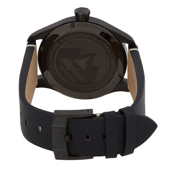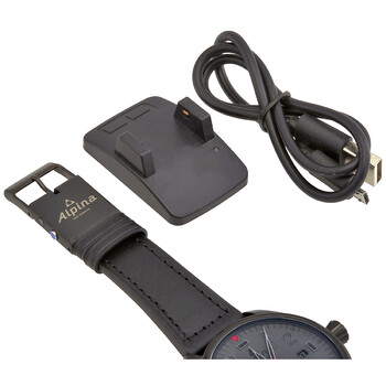 Black PVD stainless steel case with a black leather e-strap strap. Fixed black PVD bezel. Dark grey dial with luminous black leaf-style shape hands and Arabic numeral hour markers. Minute markers around the outer rim. Dial Type: Analog. Luminescent hands and markers. Date display at the 3 o'clock position. Alpina calibre AL-525 automatic movement, based upon Sellita SW200-1, containing 26 Jewels, bitting at 28800 vph, and has a power reserve of approximately 38 hours. Scratch resistant sapphire crystal. Screw down crown. Solid case back. Round case shape. Case size: 44 mm. Case thickness: 10.70 mm. Band width: 22 mm. Black fibreglass tang clasp. Water resistant at 100 meters / 330 feet. Functions: date, hour, minute, second. Pilot watch style. Watch label: Swiss Made. Alpina Startimer Pilot Automatic Dark Grey Dial Men's Watch AL-525GG4FBS6.