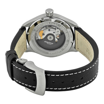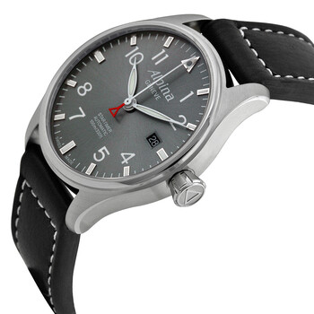 Stainless steel case with a black leather strap. Fixed stainless steel bezel. Grey dial with white hands and index / Arabic numeral hour markers. The Alpina logo appears at the 12 o'clock position. Minute markers around the outer rim. Dial Type: Analog. Luminescent hands and markers. Date display at the 3 o'clock position. Alpina calibre AL-525 automatic movement, based upon Sellita SW200-1, containing 26 Jewels, bitting at 28800 vph, and has a power reserve of approximately 38 hours. Scratch resistant sapphire crystal. Transparent sapphire case back. Round case shape. Case size: 40 mm. Band width: 2 mm / 20 mm. Deployment clasp. Water resistant at 100 meters / 330 feet. Functions: date, hour, minute, second. Startimer Pilot Series. Pilot watch style. Watch label: Swiss Made. Item Variations: AL 525G3S6, AL.525G3S6, AL525G3S6. Alpina Startimer Pilot Automatic Grey Dial Black Leather Men's Watch AL-525G3S6.