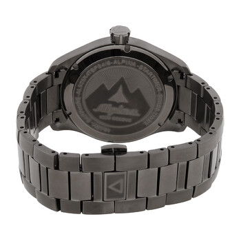 Black-plated stainless steel case and bracelet. Fixed black-plated bezel. Grey dial with luminous silver-tone hands and Arabic numeral hour markers. Index markers appear at the 3, 6, 9 and 12 o'clock positions. Arabic numeral minute markers (at 5 minute intervals). Minute markers around the inner rim. Dial Type: Analog. Luminescent hands and markers. Date display at the 3 o'clock position. Alpina calibre AL-525 automatic movement, based upon Sellita SW200-1, containing 26 Jewels, bitting at 28800 vph, and has a power reserve of approximately 38 hours. Scratch resistant sapphire crystal. Screw down crown. Solid case back. Round case shape. Case size: 44 mm. Case thickness: 10.74 mm. Band width: 23 mm. Fold over clasp. Water resistant at 100 meters / 330 feet. Functions: date, hour, minute, second. Startimer Pilot Series. Casual watch style. Watch label: Swiss Made. Alpina Startimer Pilot Automatic Grey Dial Men's Watch AL-525G4TS6B.