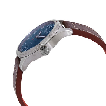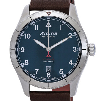 Silver-tone stainless steel case with a brown leather strap. Fixed silver-tone stainless steel bezel. Petroleum blue dial with silver-tone hands and Arabic numeral hour markers. Arabic numeral minute markers (at 5 minute intervals). Dial Type: Analog. Luminescent hands and markers. Date display at the 6 o'clock position. Alpina Calibre AL-525 Automatic movement, based upon Sellita SW200-1, containing 26 Jewels, bitting at 28800 vph, and has a power reserve of approximately 38 hours. Scratch resistant sapphire crystal. Solid case back. Round case shape, case size: 41 mm, case thickness: 11.5 mm. Water resistant at 100 meters / 330 feet. Functions: date, hour, minute, second. Startimer Pilot Series. Sport watch style. Watch label: Swiss Made. Alpina Startimer Pilot Automatic Petroleum Blue Dial Men's Watch AL-525NW4S26.