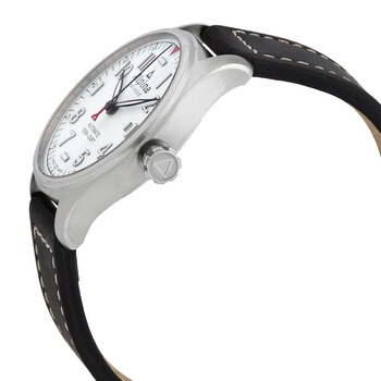 Silver-tone stainless steel case with a black leather strap. Fixed silver-tone stainless steel bezel. White dial with black hands and Arabic numeral hour markers. Arabic numeral minute markers (at 5 minute intervals). Dial Type: Analog. Luminescent hands and markers. Date display at the 3 o'clock position. Alpina Calibre AL-525 Automatic movement, based upon Sellita SW200-1, containing 26 Jewels, bitting at 28800 vph, and has a power reserve of approximately 38 hours. Scratch resistant sapphire crystal. Screw down crown. Solid case back. Round case shape, case size: 40 mm, case thickness: 10.2 mm. Band width: 22 mm. Tang clasp. Water resistant at 100 meters / 330 feet. Functions: date, hour, minute, second. Startimer Pilot Series. Pilot watch style. Watch label: Swiss Made. Alpina Startimer Pilot Automatic White Dial Men's Watch AL-525S3S6.