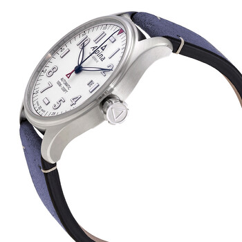 Silver-tone stainless steel case with a blue leather strap. Fixed silver-tone stainless steel bezel. White dial with luminous black hands and Arabic numeral hour markers. Minute markers around the outer rim. Dial Type: Analog. Luminescent hands and markers. Date display at the 3 o'clock position. Caliber AL-525 automatic movement with a 38-hour power reserve. Scratch resistant sapphire crystal. Screw down crown. Solid case back. Round case shape, case size: 44 mm, case thickness: 10.7 mm. Band width: 22 mm. Tang clasp. Water resistant at 100 meters / 330 feet. Functions: date, hour, minute, second. Startimer Pilot Series. Pilot watch style. Watch label: Swiss Made. Alpina Startimer Pilot Automatic White Dial Men's Watch AL-525S4S6-QK.