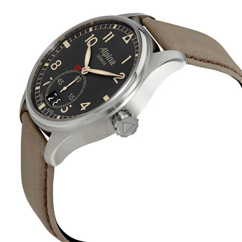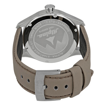 Silver-tone stainless steel case with a beige leather strap. Fixed silver-tone stainless steel bezel. Matte grey dial with luminous silver-tone leaf-style shape hands and Arabic numeral hour markers. Minute markers around the outer rim. Dial Type: Analog. Luminescent hands and markers. Date display at the 6 o'clock position. One subdial displaying: small second. Alpina Calibre AL-280 quartz movement. Scratch resistant sapphire crystal. Solid case back. Round case shape, case size: 44 mm, case thickness: 12.5 mm. Band width: 22 mm. Tang clasp. Water resistant at 100 meters / 330 feet. Functions: date, hour, minute, second. Startimer Pilot Series. Pilot watch style. Watch label: Swiss Made. Alpina Startimer Pilot Big Date Matte Grey Dial Men's Watch AL-280BGR4S6.