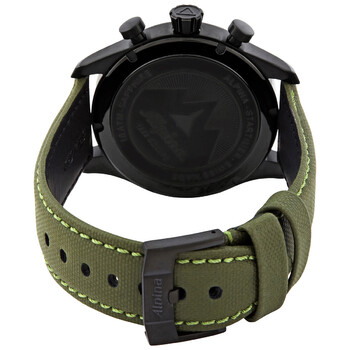 Black PVD stainless steel case with a military green leather strap. Fixed black PVD bezel. Military green dial with luminous hands and Arabic numeral hour markers. Minute markers around the outer rim. Dial Type: Analog. Luminescent hands. Date display at the 6 o'clock position. Chronograph - three sub-dials displaying: 60 second, 60 minute and 1/10th of a second. Alpina calibre AL-372 quartz movement. Scratch resistant sapphire crystal. Screw down crown. Solid case back. Round case shape. Case size: 44 mm. Case thickness: 13 mm. Band width: 22 mm / 20 mm. Band length: 8 inches. Tang clasp. Water resistant at 100 meters / 330 feet. Functions: chronograph, date, hour, minute, second. Startimer Pilot Series. Pilot watch style. Watch label: Swiss Made. Item Variations: AL 372GR4FBS6, AL.372GR4FBS6, AL372GR4FBS6. Alpina Startimer Pilot Chronograph Green Dial Men's Watch AL-372GR4FBS6.
