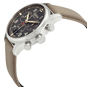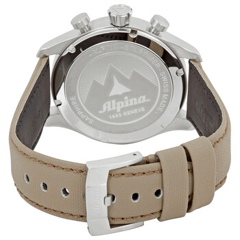 Stainless steel case with a sand cordura fabric strap. Fixed stainless steel bezel. Camouflage grey dial with gold-tone hands and index and Arabic numeral hour markers. The Alpina logo marks the 12 o'clock position. Minute markers around the outer rim. Dial Type: Analog. Luminescent hands and markers. Date display at the 6 o'clock position. Chronograph - three sub-dials displaying: 60 second, 30 minute and 1/10th of a second. Alpina calibre AL-372 quartz movement. Scratch resistant sapphire crystal. Solid case back. Round case shape. Case size: 44 mm. Case thickness: 12 mm. Band width: 22 mm / 20 mm. Band length: 8 inches. Tang clasp. Water resistant at 100 meters / 330 feet. Functions: chronograph, date, hour, minute, second. Startimer Pilot Series. Pilot watch style. Watch label: Swiss Made. Item Variations: AL 372BGR4S6, AL.372BGR4S6, AL372BGR4S6. Alpina Startimer Pilot Chronograph Grey Dial Men's Watch AL-372BGR4S6.