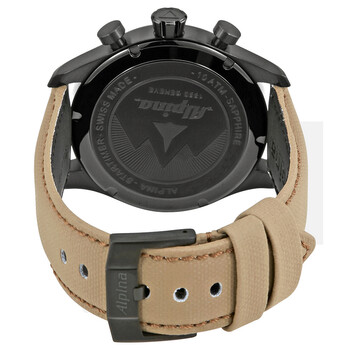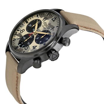 Black PVD stainless steel case with a military green cordura nylon strap. Fixed black PVD bezel. Camouflage dial with luminous gold-tone hands and Arabic numeral hour markers. Minute markers around the outer rim. Dial Type: Analog. Luminescent hands. Date display at the 6 o'clock position. Chronograph - three black sub-dials displaying: 60 second, 30 minute and 1/10th of a second. Alpina calibre AL-372 quartz movement. Scratch resistant sapphire crystal. Solid case back. Round case shape. Case size: 44 mm. Case thickness: 13.5 mm. Band width: 22 mm. Tang clasp. Water resistant at 100 meters / 330 feet. Functions: chronograph, date, hour, minute, second. Sport watch style. Watch label: Swiss Made. Alpina Startimer Pilot Chronograph Men's Watch 372MLY4FBS6.
