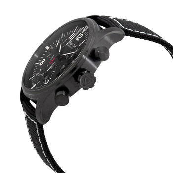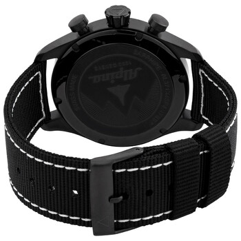 Black PVD stainless steel case with a black leather strap. Fixed black PVD stainless steel bezel. Black dial with black hands and alternating Arabic numeral and index hour markers. Minute markers around the outer rim. Luminescent hands and markers. Date display at the 5 o'clock position. Chronograph - three sub-dials displaying: 60 second, 30 minute & day of the week. Alpina calibre AL-371 quartz movement. Scratch resistant sapphire crystal. Screw down crown. Solid case back. Round case shape. Case size: 42 mm. Band width: 22 mm. Buckle clasp. Water resistant at 100 meters / 330 feet. Functions: chronograph, day, date, hour, minute, second. Casual watch style. Watch label: Swiss Made. Alpina Startimer Pilot Chronograph Quartz Black Dial Men's Watch AL-371BB4FBS6.