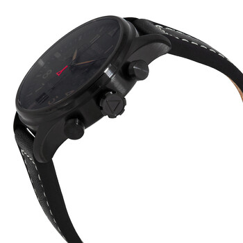 Black PVD stainless steel case with a black leather strap. Fixed black PVD stainless steel bezel. Black dial with black hands and Arabic numeral and index hour markers. Minute markers around the outer rim. Dial Type: Analog. Luminescent hands and markers. Date display at the 6 o'clock position. Chronograph - three sub-dials displaying: 60 second, 30 minute and 1/10th of a second. Alpina Calibre AL-372 quartz movement. Scratch resistant sapphire crystal. Screw down crown. Solid case back. Round case shape, case size: 44 mm, case thickness: 11 mm. Band width: 22 mm. Tang clasp. Water resistant at 100 meters / 330 feet. Functions: chronograph, big date, hour, minute, second. Startimer Pilot Series. Pilot watch style. Alpina Startimer Pilot Chronograph Quartz Black Dial Men's Watch AL-372BBG4FBS26.