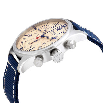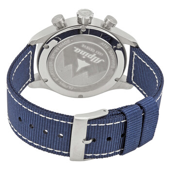 Stainless steel case with a blue nylon strap. Fixed stainless steel bezel. Beige dial with luminous blue hands and alternating Arabic numeral and index hour markers. Minute markers around the outer rim. Dial Type: Analog. Luminescent hands. Date display at the 4 o'clock position. Chronograph - two sub-dials displaying: 60 second and 30 minute. Day of the week sub-dial. Alpina calibre AL-371 quartz movement. Scratch resistant sapphire crystal. Screw down crown. Solid case back. Round case shape. Case size: 42 mm. Case thickness: 11 mm. Band width: 22 mm. Tang clasp. Water resistant at 100 meters / 330 feet. Functions: chronograph, date, day, hour, minute, second. Pilot watch style. Watch label: Swiss Made. Alpina Startimer Pilot Chronograph Quartz Men's Watch AL-371BG4S6.