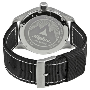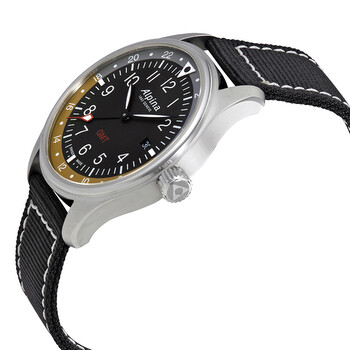 Silver-tone stainless steel case with a black canvas strap. Fixed silver-tone stainless steel bezel. Black dial with luminous black hands and Arabic numeral hour markers. Minute markers. 24 hoour markers around the outer rim. Dial Type: Analog. Luminescent hands and markers. Date display at the 3 o'clock position. Alpina Calibre AL-247 quartz movement. Scratch resistant sapphire crystal. Solid case back. Round case shape, case size: 42 mm, case thickness: 10 mm. Band width: 21 mm. Tang clasp. Water resistant at 100 meters / 330 feet. Functions: GMT, second time zone, hour, minute, second, date. Casual watch style. Watch label: Swiss Made. Alpina Startimer Pilot GMT Black Dial Men's Watch AL-247BBG4S6.