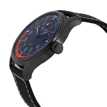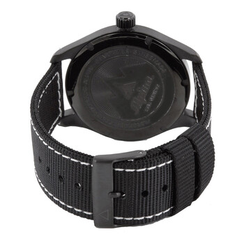 Black PVD stainless steel case with a black nylon strap. Fixed black PVD bezel. Navy blue dial with luminous black hands and Arabic numeral hour markers. Minute markers. 24 hour (GMT) markers around the inner rim. Dial Type: Analog. Luminescent hands and index. Date display at the 3 o'clock position. Alpina calibre AL-247 quartz movement. Scratch resistant sapphire crystal. Screw down crown. Solid case back. Round case shape. Case size: 42 mm. Case thickness: 9 mm. Band width: 20 mm. Tang clasp. Water resistant at 100 meters / 330 feet. Functions: date, hour, minute, second. Casual watch style. Watch label: Swiss Made. Alpina Startimer Pilot GMT Black PVD Men's Watch AL-247NOG4FBS6.
