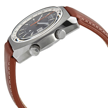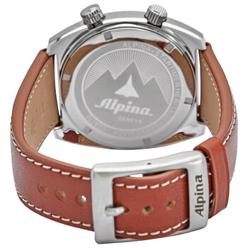Stainless steel case with a light brown leather strap. Fixed stainless steel bezel. Dark grey dial with luminous silver-tone hands and index hour markers. Minute markers. 24 hour markers around the outer rim. Dial Type: Analog. Luminescent hands and markers. Date display at the 3 o'clock position. Alpina calibre AL-555 automatic movement with a 38-hour power reserve. Scratch resistant sapphire crystal. Screw down crown. Solid case back. Cushion case shape. Case size: 42 mm. Case thickness: 13 mm. Band width: 23 mm. Tang clasp. Water resistant at 100 meters / 330 feet. Functions: date, GMT, hour, minute, second. Additional Info: stainless steel case with silver internal turning ring. Starttimer Pilot Hertiage Series. Pilot watch style. Watch label: Swiss Made. Alpina Starttimer Pilot Heritage Automatic Dark Grey Men's Watch AL-555DGS4H6.