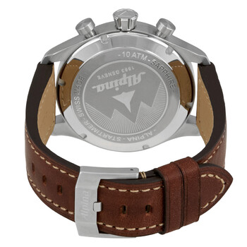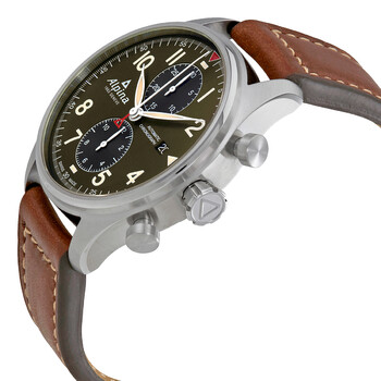 Stainless steel case with a brown leather strap. Fixed stainless steel bezel. Matte military green dial with silver-tone leaf-style shape hands and Arabic numeral hour markers. Arabic numeral minute markers (at 5 minute intervals). Minute markers around the outer rim. Dial Type: Analog. Luminescent hands and markers. Date display at the 3 o'clock position. Chronograph - two sub-dials displaying: 30 minute and 12 hour. Alpina calibre AL-725 automatic movement, based upon ETA Valjoux 7750, containing 25 Jewels, bitting at 28800 vph, and has a power reserve of approximately 46 hours. Scratch resistant sapphire crystal. Screw down crown. Solid case back. Round case shape. Case size: 44 mm. Case thickness: 14.6 mm. Band width: 22 mm. Tang clasp. Water resistant at 100 meters / 330 feet. Functions: chronograph, date, hour, minute, second. Startimer Pilot Series. Pilot watch style. Watch label: Swiss Made. Alpina Startimer Pilot Matte Military Green Dial Automatic Men's Chronograph Watch AL-725GR4S6.