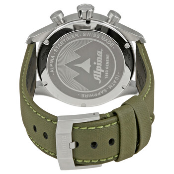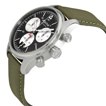 Silver-tone stainless steel case with a green (barenia calfskin) leather strap. Fixed silver-tone stainless steel bezel. Black dial with luminous silver-tone hands and index hour markers. Minute markers around the outer rim. Dial Type: Analog. Luminescent hands. Date display at the 6 o'clock position. Chronograph - three sub-dials displaying: 60 second, 60 minute and 1/10th of a second. Alpina Calibre AL-372 quartz movement. Scratch resistant sapphire crystal. Solid case back. Round case shape, case size: 44 mm, case thickness: 10 mm. Band width: 22 mm. Tang clasp. Water resistant at 100 meters / 330 feet. Functions: chronograph, date, hour, minute, second. Military watch style. Watch label: Swiss Made. Item Variations: AL 372BS4S6, AL.372BS4S6, AL372BS4S6. Alpina Startimer Pilot Military Green Big Date Chronograph Men's Watch AL-372BS4S6.