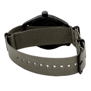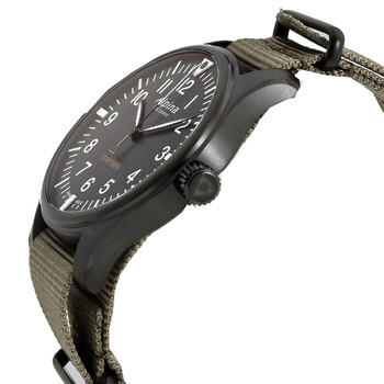 Black PVD stainless steel case with a grey nylon strap. Fixed black PVD stainless steel bezel. Black dial with luminous black hands and Arabic numeral hour markers. Minute markers around the outer rim. Dial Type: Analog. Luminescent hands and markers. Alpina Calibre AL-240 quartz movement. Scratch resistant sapphire crystal. Pull / push crown. Solid case back. Round case shape, case size: 42 mm, case thickness: 9 mm. Band width: 20 mm. Tang clasp. Water resistant at 100 meters / 330 feet. Functions: hour, minute, second. Startimer Pilot Series. Casual watch style. Watch label: Swiss Made. Alpina Startimer Pilot Quartz Black Dial Men's Watch AL-235B4FBS6.