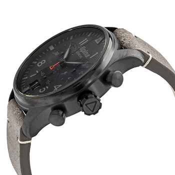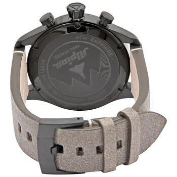Black PVD stainless steel case with a grey leather strap. Fixed black PVD bezel. Black dial with luminous black leaf-style hands and alternating Arabic numeral and index hour markers. Minute markers around the outer rim. Dial Type: Analog. Luminescent hands and markers. Chronograph - three sub-dials displaying: 60 second, 30 minute and 1/10th of a second. Alpina calibre AL-372 quartz movement. Scratch resistant sapphire crystal. Pull / push crown. Solid case back. Round case shape. Case size: 44 mm. Case thickness: 13 mm. Band width: 22 mm. Tang clasp. Water resistant at 100 meters / 330 feet. Functions: chronograph, hour, minute, second. Sport watch style. Watch label: Swiss Made. Alpina Startimer Pilot Shadow Chronograph Men's Watch AL-372BB4FBS26.