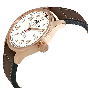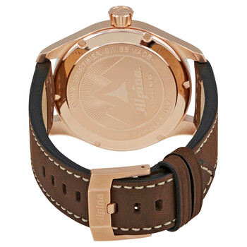 Gold-tone stainless steel case with a brown leather strap. Fixed gold-tone stainless steel bezel. White dial with gold-tone hands and Arabic numeral hour markers. Index markers appear at the 3, 6, 9 and 12 o'clock positions. Minute markers around the outer rim. Dial Type: Analog. Luminescent hands and markers. Date display at the 3 o'clock position. Alpina calibre AL-525 automatic movement with a 38-hour power reserve. Scratch resistant sapphire crystal. Round case shape, case size: 44 mm, case thickness: 10.7 mm. Water resistant at 100 meters / 330 feet. Functions: date, hour, minute, second. Casual watch style. Watch label: Swiss Made. Alpina Startimer Pilot White Dial Automatic Men's Leather Watch AL-525S4S4.