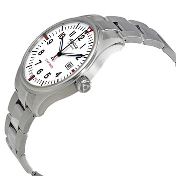 Stainless steel case with a stainless steel bracelet. Fixed stainless steel bezel. White dial with luminous black hands and Arabic numeral hour markers. Minute markers around the outer rim. Dial Type: Analog. Luminescent hands. Date display at the 3 o'clock position. Alpina calibre AL-240 quartz movement. Scratch resistant sapphire crystal. Screw down crown. Solid case back. Case size: 42 mm. Case thickness: 9.4 mm. Round case shape. Band width: 20 mm. Deployment clasp with a double push button release. Water resistant at 100 meters / 330 feet. Functions: date, hour, minute, second. Additional Info: in general, suitable for swimming and snorkeling, but not diving. Dress watch style. Watch label: Swiss Made. Alpina Startimer Pilot White Dial Stainless Steel Men's Watch AL-240S4S6B.
