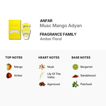 Part of the Amber Floral fragrance family, Musc Mango Adyan opens with the juicy sweetness of ripe mango, balanced perfectly by the golden warmth of amber. This vibrant introduction transitions into a soft heart of delicate lily of the valley, sensual musk, and rich agarwood, creating a comforting yet mysterious aroma. The base notes of zesty bergamot, creamy sandalwood, and earthy patchouli bring a grounding finish that lingers beautifully on the skin.