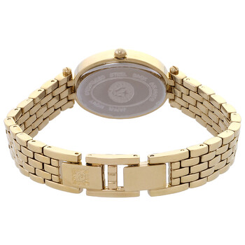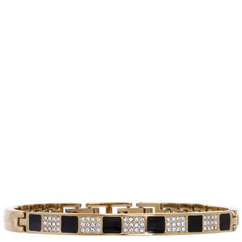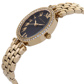 Gold-tone alloy case and bracelet. Fixed gold-tone bezel with crystal set. Black dial with gold-tone hands and Roman numeral hour markers. Dial Type: Analog. Quartz movement. Pull / push crown. Solid case back. Oval case shape, case size: 27 mm. Fold over clasp. Water resistant at 30 meters / 100 feet. Functions: hour, minute, second. Dress watch style. Watch label: Japan Movt. Item Variations: 4076BKST. Anne Klein Quartz Crystal Black Dial Ladies Watch and Bracelet Set AK/4076BKST.