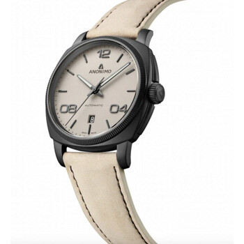 Black stainless steel case with a brown leather strap. Fixed black bezel. Beige dial with black hands and index-Arabic numeral hour markers. Minute scale around the inner rim. Dial Type: Analog. Luminescent hands. Date display at the 6 o'clock position. Anonimo Calibre SW200.1 automatic movement with a 38-hour power reserve. Scratch resistant sapphire crystal. Screw down crown. Transparent see through case back. Cushion case shape, case size: 42 mm, case thickness: 11.60 mm. Buckle clasp. Water resistant at 50 meters / 165 feet. Functions: date, hour, minute, second. Epurato Series. Sport watch style. Watch label: Swiss Made. Anonimo Epurato Automatic Men's Watch AM-4000.02.229.K19.