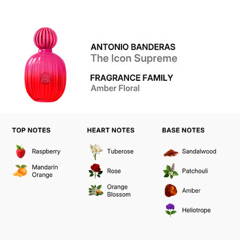 The Icon Supreme opens with a burst of juicy raspberry and zesty mandarin orange, delivering a fresh and inviting start. As the fragrance unfolds, a rich floral heart of tuberose, rose, and orange blossom adds a graceful and romantic layer, embracing your senses with feminine warmth. The luxurious base features creamy sandalwood, earthy patchouli, golden amber, and soft heliotrope, wrapping you in a lasting and unforgettable trail.
