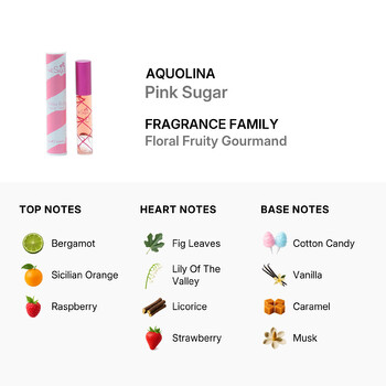 Pink Sugar belongs to the Floral Fruity Gourmand fragrance family, offering a captivating mix of sugary notes and fresh florals. It opens with a burst of juicy raspberry, crisp bergamot, and bright Sicilian orange, setting a cheerful tone from the first spritz. The heart reveals a blend of fig leaves, strawberry, red fruits, lily of the valley, and a hint of licorice, adding a unique and whimsical touch to the composition.