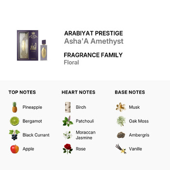 Asha'A Amethyst opens with a vibrant burst of pineapple, bergamot, black currant, and apple—creating a fruity, fresh top layer that’s both exciting and inviting. As the fragrance unfolds, the heart reveals a romantic bouquet of birch, patchouli, Moroccan jasmine, and rose, adding a floral richness with an earthy touch that feels effortlessly sophisticated.