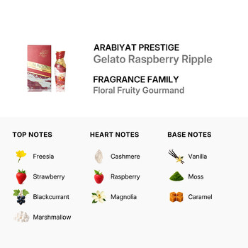 Experience a delightful swirl of sweetness and elegance with Arabiyat Prestige Gelato Raspberry Ripple Eau de Parfum Spray for Ladies. This 3.4 oz fragrance is a charming blend of fruity, floral, and gourmand notes that instantly uplifts the senses. Created by the renowned Middle Eastern fragrance house Arabiyat Prestige from the United Arab Emirates, this scent is crafted for modern women who love to stand out with style and grace.