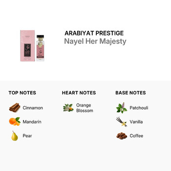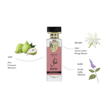 Nayel Her Majesty opens with a warm and inviting burst of cinnamon, mandarin, and pear, creating a vibrant and spicy-sweet introduction. As the fragrance unfolds, its heart reveals the delicate essence of orange blossom—a floral note that adds softness and charm. The base lingers beautifully with rich patchouli, creamy vanilla, and a hint of bold coffee, leaving a deep and lasting impression that’s both comforting and unforgettable.