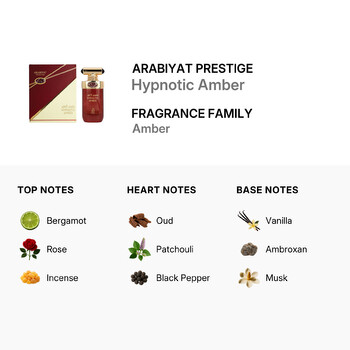 Hypnotic Amber opens with a striking mix of bergamot, rose, and incense. These top notes create an energizing yet smooth introduction that instantly intrigues the senses. As the fragrance settles, the heart reveals a luxurious blend of oud, patchouli, and black pepper—adding depth, warmth, and a hint of spice that speaks to a confident and adventurous spirit.