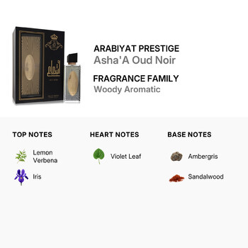Belonging to the Woody Aromatic fragrance family, Asha'A Oud Noir opens with a refreshing blend of lemon verbena and iris, offering a crisp and elegant introduction. As the scent develops, heart notes of violet leaf add a clean, green sophistication that’s both modern and timeless. The base reveals the rich, warm embrace of ambergris and sandalwood, leaving a smooth and sensual trail that captures attention without overwhelming the senses.