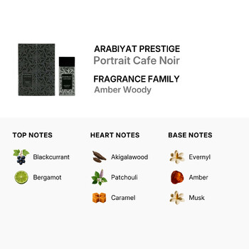 Arabiyat Prestige, a celebrated design house specializing in Middle Eastern fragrances, brings their signature artistry to every bottle. Portrait Cafe Noir is crafted for those who appreciate bold blends and lasting impressions, making it a standout scent for any collection.